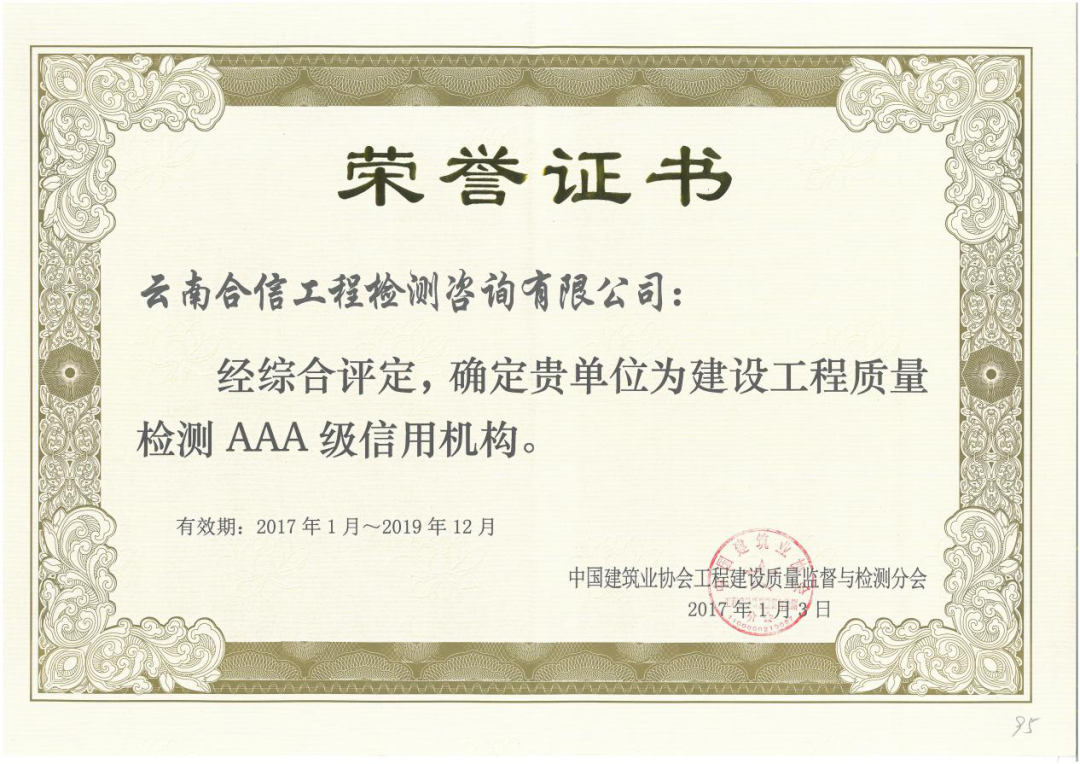 為進(jìn)一步增強(qiáng)企業(yè)競(jìng)爭(zhēng)力,加快企業(yè)信用體系建設(shè),云南合信工程檢測(cè)咨詢(xún)有限公司根據(jù)中國(guó)建筑業(yè)協(xié)會(huì)質(zhì)量管理與監(jiān)督檢測(cè)分會(huì)《關(guān)于開(kāi)展2020年度建筑業(yè)AAA級(jí)信用企業(yè)(檢測(cè)機(jī)構(gòu))評(píng)價(jià)推薦工作的通知》要求,積極組織開(kāi)展評(píng)價(jià)籌備工作;近日,中國(guó)建筑業(yè)協(xié)會(huì)質(zhì)量管理與監(jiān)督檢測(cè)分會(huì)發(fā)布通知,我司榮獲由中國(guó)建筑業(yè)協(xié)會(huì)頒發(fā)的AAA級(jí)企業(yè)信用等級(jí)證書(shū)。