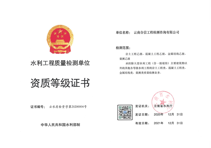 近日,國(guó)檢集團(tuán)-云南合信工程檢測(cè)咨詢有限公司正式取得“水利工程質(zhì)量檢測(cè)單位乙級(jí)資質(zhì)”,至此,公司可承擔(dān)水利工程類質(zhì)量檢測(cè)業(yè)務(wù)啦!