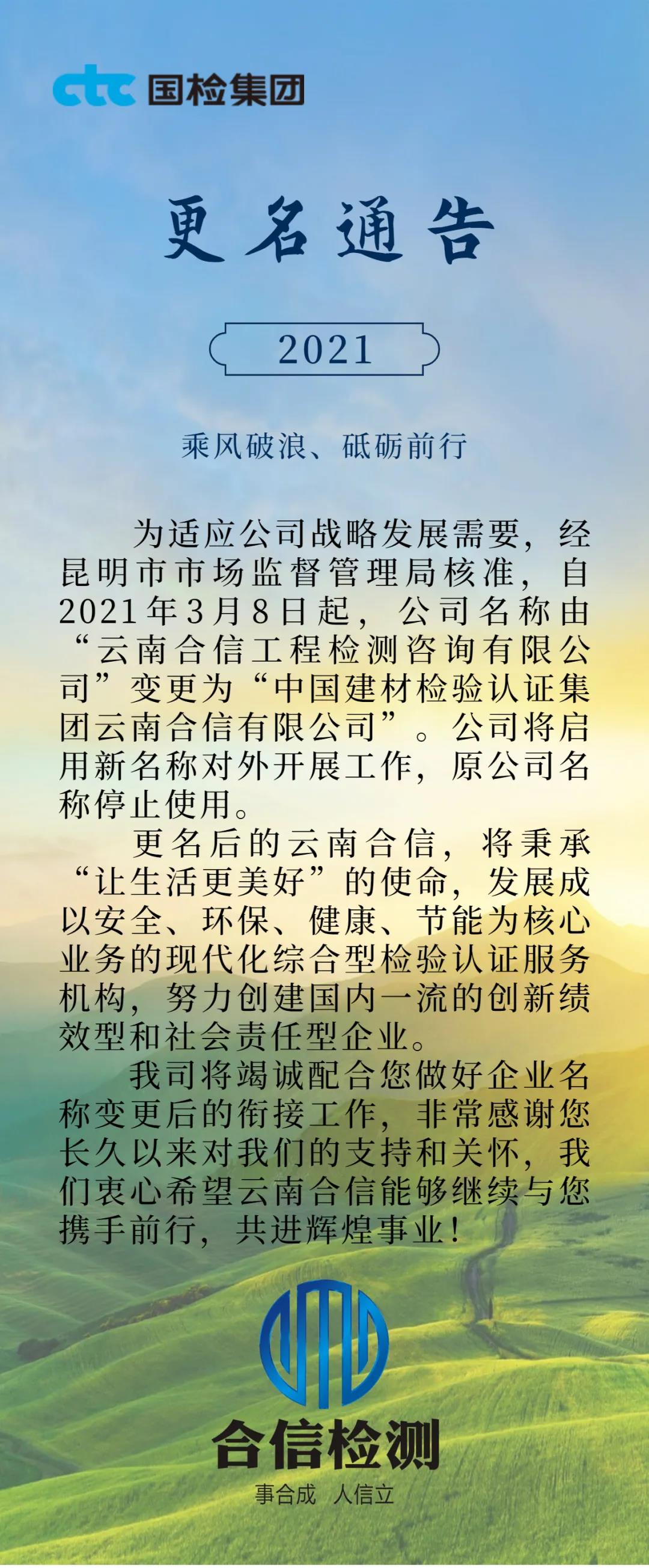 國檢集團·云南合信﹣公司名稱變更通告