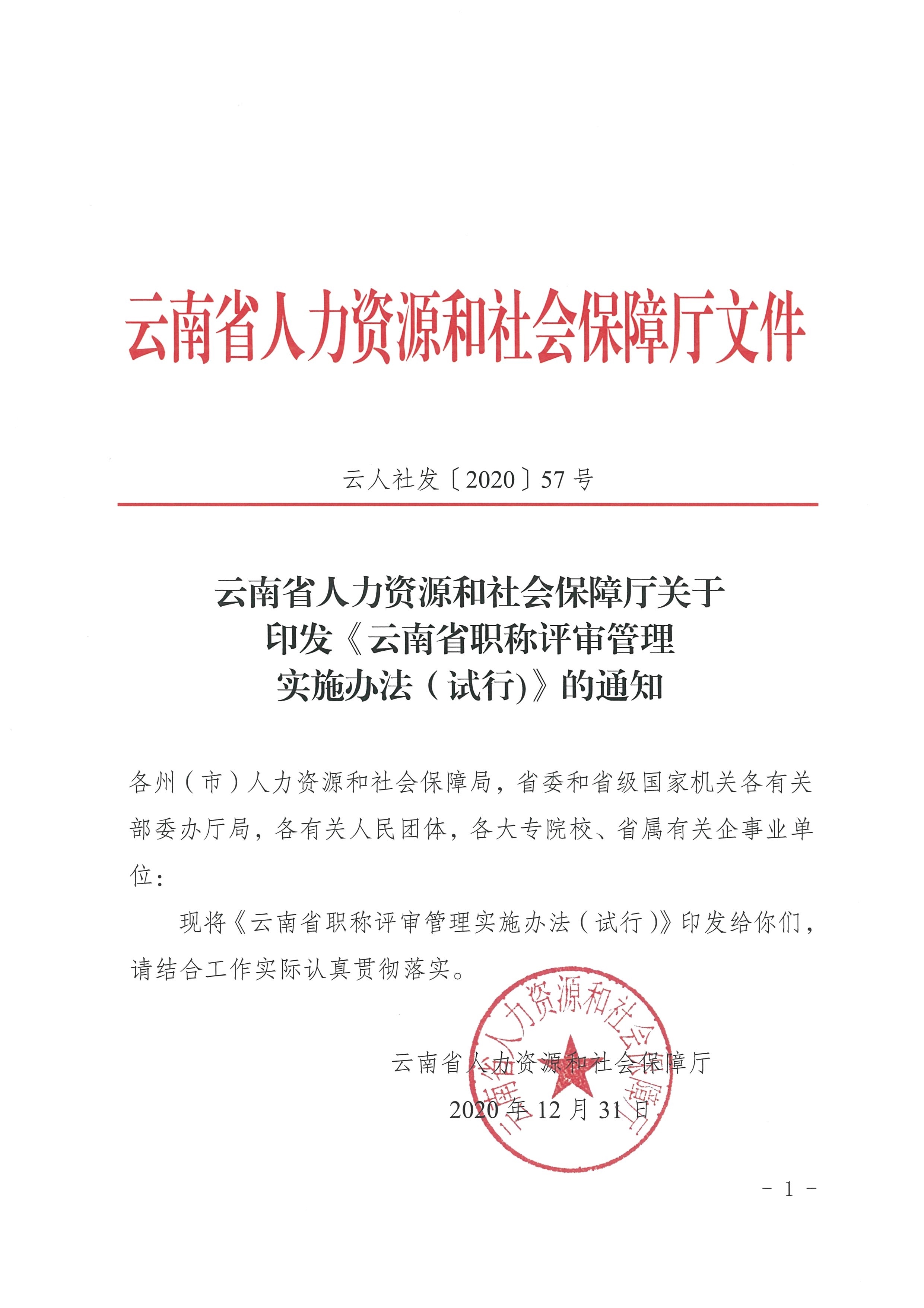 云南省人力資源和社會保障廳關(guān)于印發(fā)《云南省職稱評審管理實施辦法(試行)》的通知
