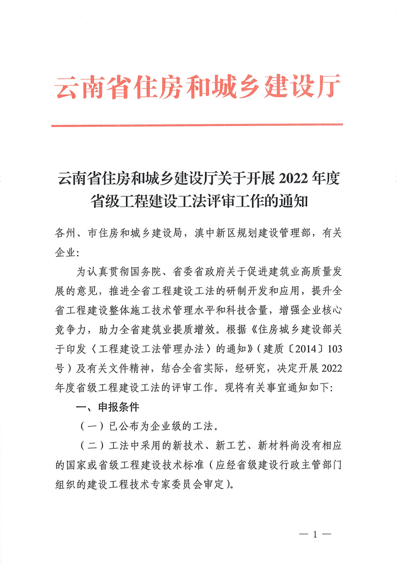 云南省住房和城鄉(xiāng)建設(shè)廳關(guān)于開(kāi)展2022年度省級(jí)工程建設(shè)工法評(píng)審工作的通知
